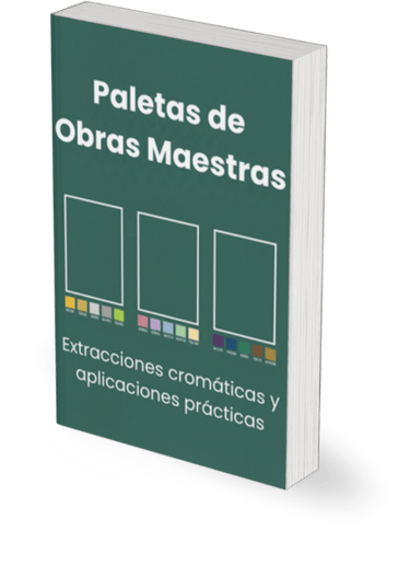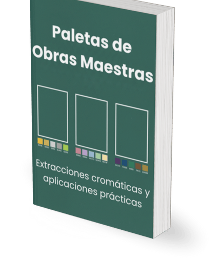 Láminas con la obra + extracción de colores en chips (con nombre). Referencias rápidas para estudiar decisiones de color reales.
